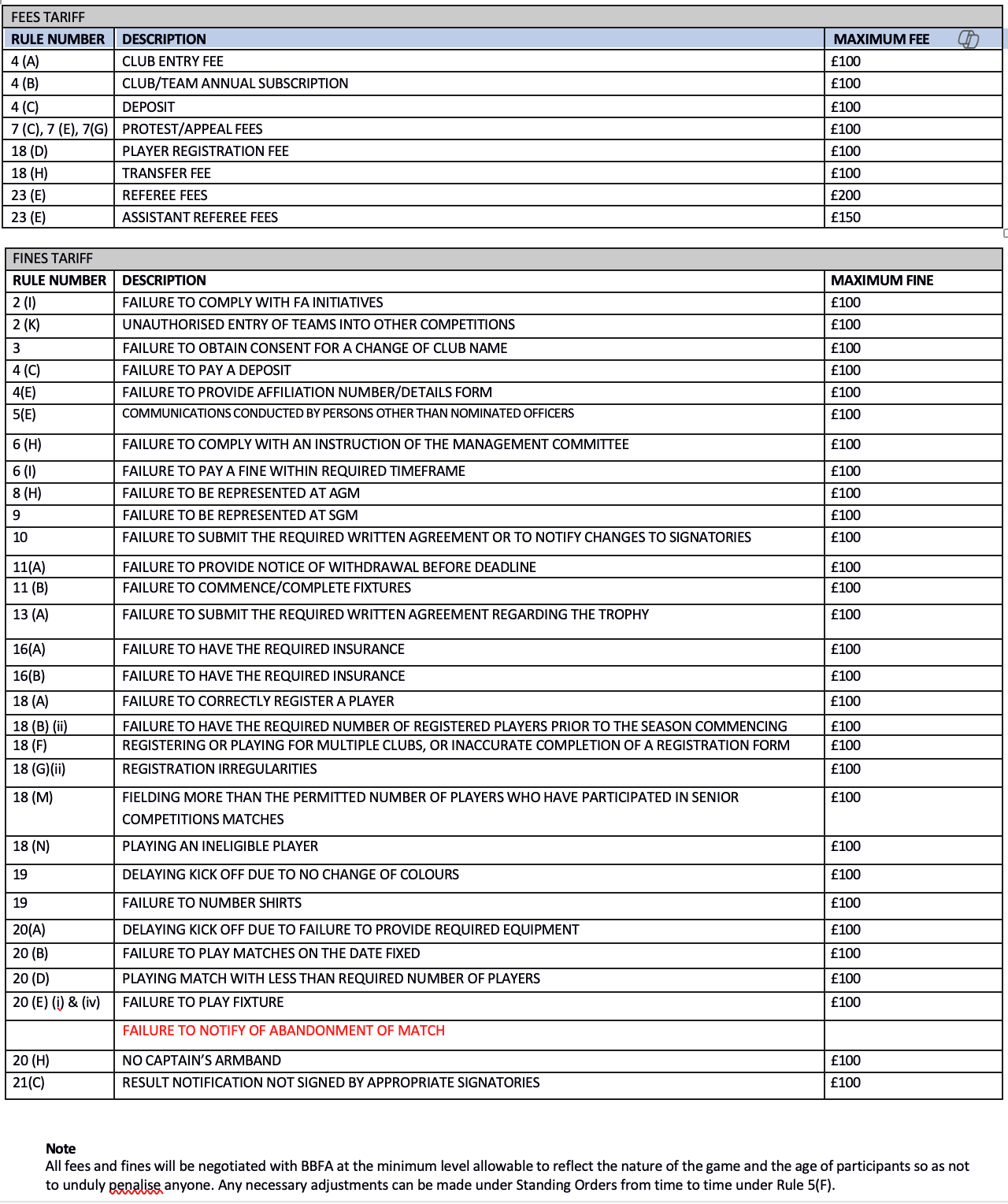 18.D A fee as set out in the Fees Tariff shall be paid by each Club/Team for each Player registered.